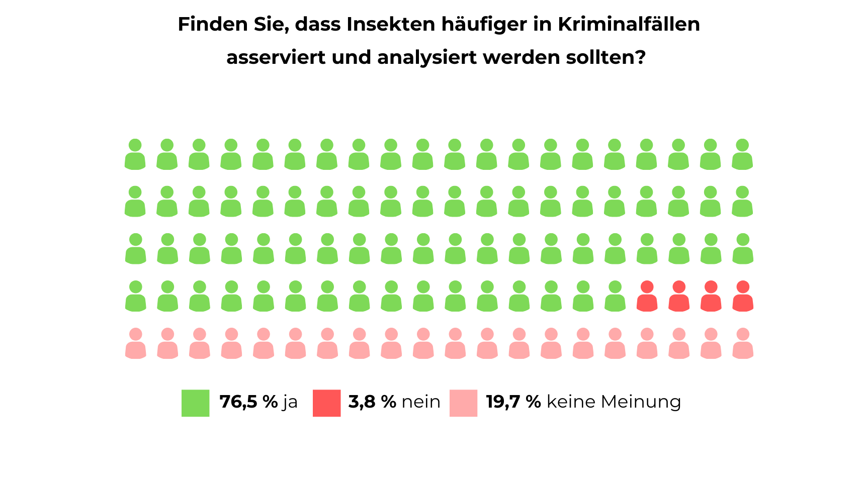 70-80 % aller Teilnehmer*innen geben an, dass Insekten häufiger in Kriminalfällen asserviert und analysiert werden sollten. Das freut uns sehr, denn nur gemeinsam, in Zusammenarbeit mit den verschiedenen Disziplinen, können wir ein solches Projekt realisieren und nachhaltig etwas verändern.